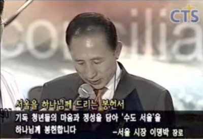 | < rimgcaption > ▲이명박 대통령은 서울시장으로 재직 중이던 2004년 년 5월 31일 한 기독교 행사에 참석해 "서울시를 하나님께 봉헌한다"는 내용의 봉헌사를 낭독했다. ⓒ프레시안 |